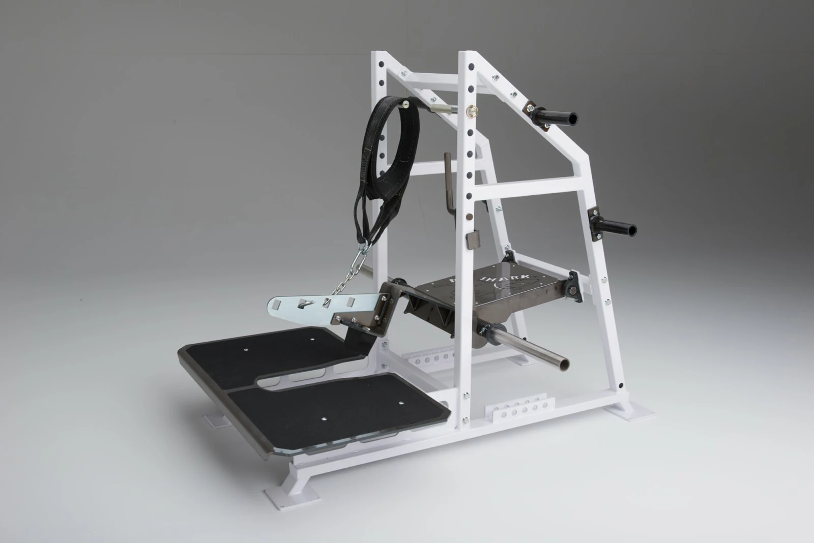 It’s Commercial Grade and is ideal for large groups or an entire squad of Athletes. Everything old is new again when it comes to the advanced design of the PIT SHARK™. Fully adjustable handles allow excercises to be done off the floor, on the foot pads, or on an optional Close Stance platform. Use with Body-Weight or hook up to the PIT SHARK™ for as heavy as you like Weight-Loaded movements with the fast, easy Speedhook Belt (included). The PIT SHARK™ removes the time-wasting Set-Up required and improves the safety of doing Body-Weight and Weight-Loaded Squats, Chins, Dips, and Calves.