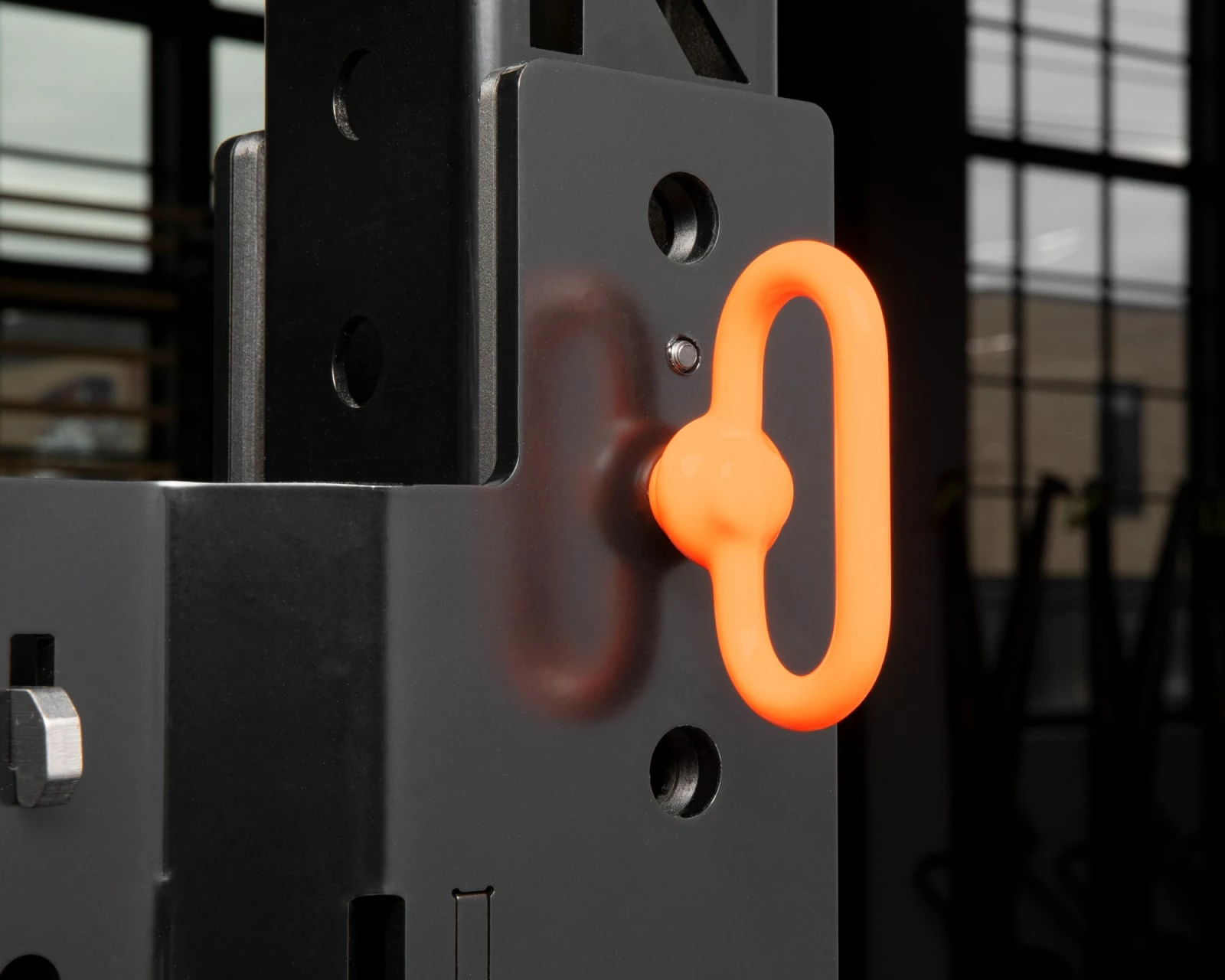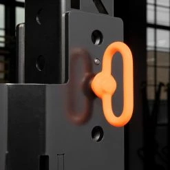 A cost-effective alternative to expensive, full-scale monolift units, the AML-2 Adjustable Monolift mounts to your rack’s uprights via a pair of 1/4” steel brackets (MG Black finish) and 5/8” detent pins. The 1.25″ wide jaw sections feature a Texture Red finish and are placed in recessed hook plastic, with an extended 8” of vertical space for re-racking (2” more than the previous model). A set of 3/8” thick steel counterweights (Texture Black finish) provide the necessary torque so that—when you lift the bar off the Monolift—the hooks will swing back approximately 5.5” toward the rack and stay there. This clears up enough extra space to go straight into your workout, and also enables safe re-racking, as the slanted angle of the unloaded hooks makes it easy to guide the bar in, overriding the counterweights and moving the Monolift back into its original position.