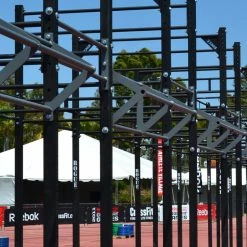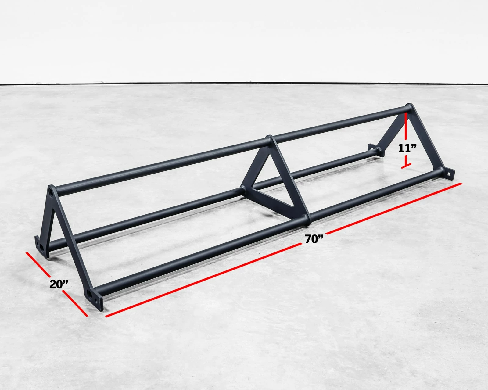 The 70” Dirty South Bar and 43” Dirty South Shorty are manufactured in Columbus, Ohio with US steel, and feature a pair of 1.25″ diameter bars with grip-friendly, black powder coat finishes. The triangular design of the unit allows athletes to work from the low or high position bar.