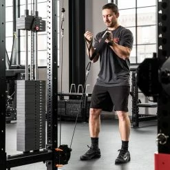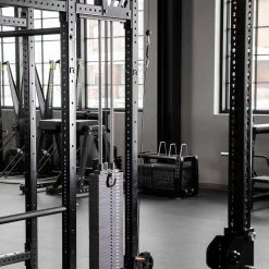 This unit can be used with with Band, Plate Load, and Weight Stack styles of the Slinger, as well as 90”, 100”, and 108” ML power racks. Once assembled, it can be mounted to an upright using the included pair of removable detent pins, or permanently installed with bolts (not included). Users can then easily move the Solo Pulley Attachment vertically along the upright depending on their own height and which exercise they wish to perform.