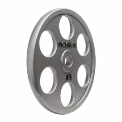 Our Rogue 6-Shooter Grip Plates feature a unique gray hammertone finish, black text, and six symmetrical grip holes spaced out around the circumference of each 25LB, 35LB, and 45LB plate (a Urethane Coated 6-Shooter is also available). The holes are precision-cut and in close proximity to the raised lip at the edge of each plate, offering athletes a comfortable grip and an easier way to lift, carry, or load a plate from any angle.