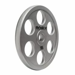 Each 6-Shooter Olympic Grip Plate includes LB markings, exclusive Rogue branding, and a 2” diameter collar opening for compatibility on any standard Oly barbell. The smaller 6-Shooter change plates (2.5LB, 5LB, and 10LB) include a center hole only, without the additional six-hole pattern.