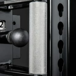 The single handle pulley assembly features a 180-degree swivel and can be quickly set up high or low depending on the workout, utilizing the knurled stainless steel adjustment handle. There are 16 different height adjustment settings on the 2×2 rail, and with acetal pads inside the handle assembly, users can easily move the swivel up and down without damaging the stainless slide tube.