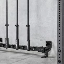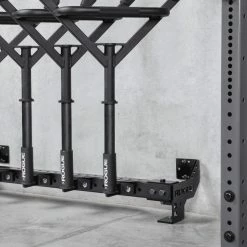 Rogue initially developed this patent-pending accessory for use in the training facility of the NHL’s Columbus Blue Jackets, and it’s now been refined for almost any type of gym layout, with mounting points spaced at 48” to fit on standard 16”-on-center wall studs. The space efficient Heavy Rail extends just 11” from the wall (11.75” with optional stringers) and measures 7-⅛” in height (from the floor to the top of the steel tube).