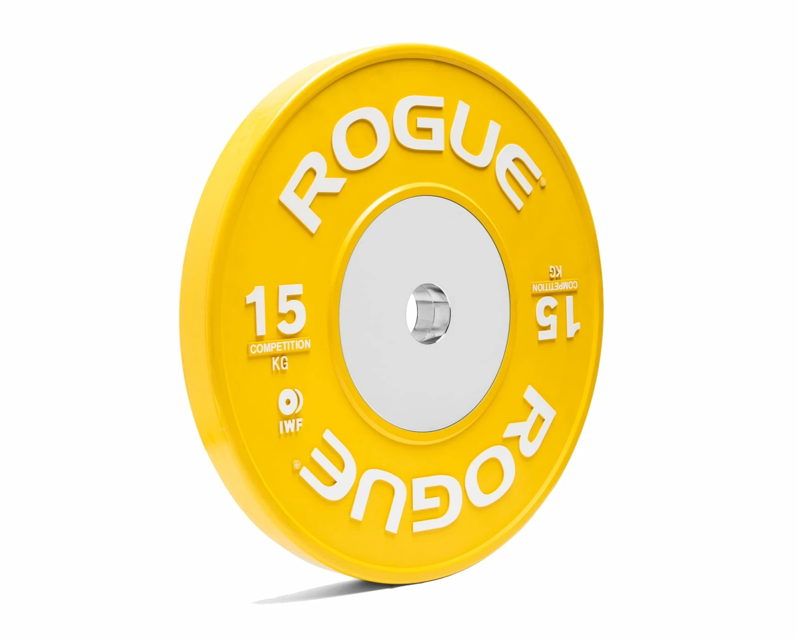Rogue’s KG Competition Plates are approved for competitive use by the International Weightlifting Federation, and now feature a gloss-matte-gloss color finish with raised lettering and official IWF branding. (The LB version is available here)