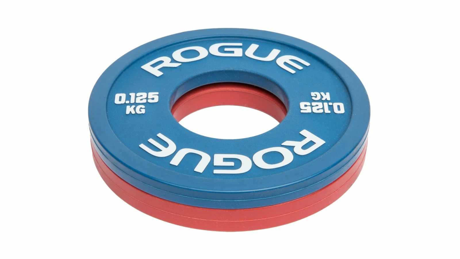 Rogue’s newly redesigned KG Fractional Plates are sold in pairs or in a 0.75KG set, with weight increments of 0.125KG (Blue), 0.25KG (Red). Each plate features a 50.40MM collar opening and an exterior rubber coating for a firm, steady hold on any standard Olympic barbell. A quality matte finish and raised white lettering give the plates a bold look, with easy recognition from a distance.