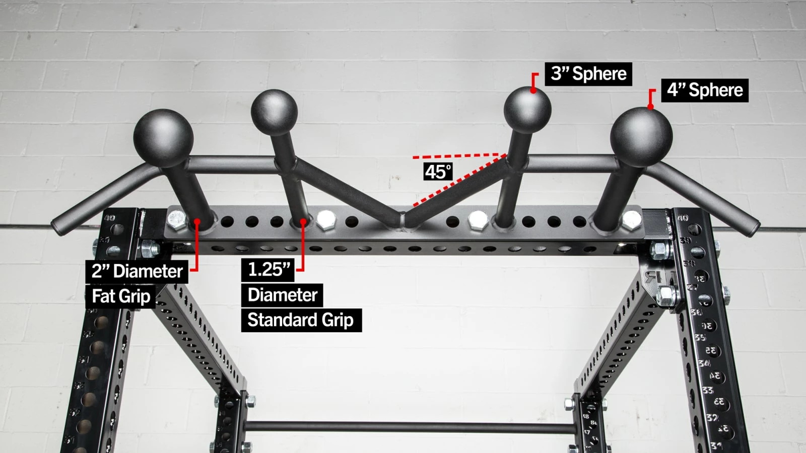 The outside neutral grips are 2″ in diameter to work grip strength, while the rest of the bars are the standard 1.25″ diameter. We’ve also welded on two pairs of 3″ and 4″ pull-up spheres for even more grip training. The 3″ spheres are spaced 16″ on center, while the 4″ are 32″ on center. All grips feature our signature black powder coat finish, and the unit ships with four Monster bolt assemblies.