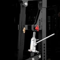 The precision monolift system on the RM44-4MONO is adaptable to athletes of any height, offering 32 incremental, hydraulic-assisted vertical adjustments, and counter-balanced lever arms with heim joint micro adjustments. When the athlete lifts a barbell off the Monolift, their spotter can then release the counter balance lock and pull a handle to swing the hooks out of their starting position and away from the athlete. This spacing creates a means of performing heavy-weight squats and bench press without having to walk or swing the bar out from the rack. It also enables safe re-racking, as the slanted angle of the unloaded hooks makes it easy to guide the bar in after the spotter returns the Monolift to its original position.