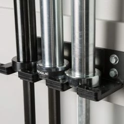 Available as a single-bar or triple-bar storage accessory, the compact Rogue Vertical Bar Hanger is made in the USA from 0.1875″ thick laser cut and formed steel, with a Protective UHMW plastic layer lining. Rather than sliding a barbell sleeve-first into a tube on the floor—like most standard vertical bar holders—this unit allows you to set up a wall-mounted or rack-mounted hanger that can store your bars efficiently above the ground, limiting the risk of any wear and tear during regular stowing and removal.